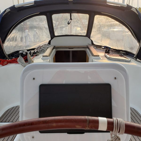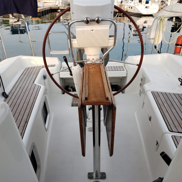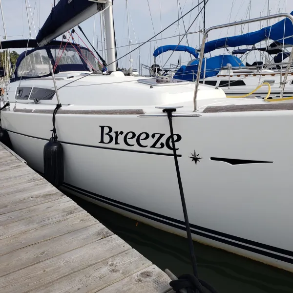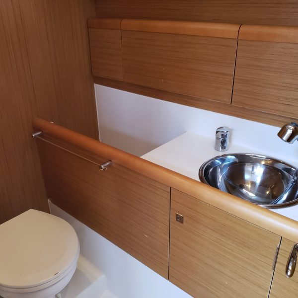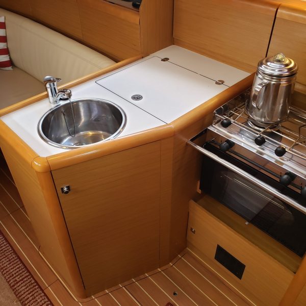 Breeze is the sporty mid-size cruiser from Jeanneau. She’s an ample sized boat, with double cabins fore and aft and the possibility of sleeping two people midships on the settees. The head with shower is a good size and there’s a full galley including stove, oven and refrigeration.