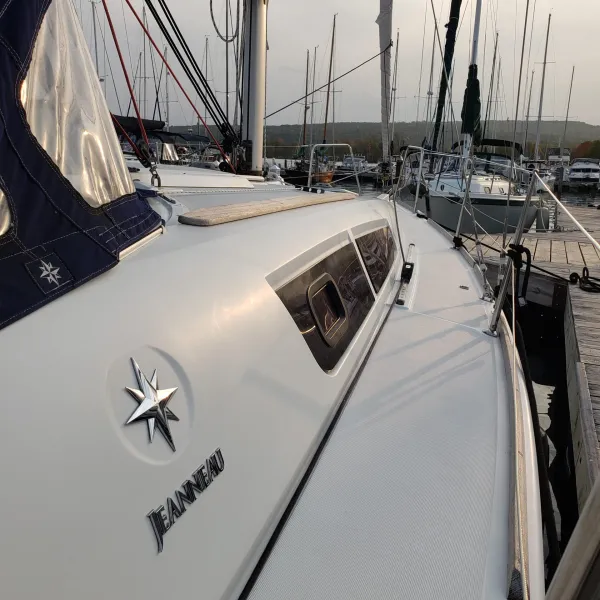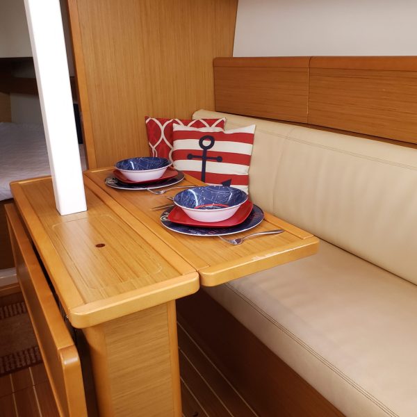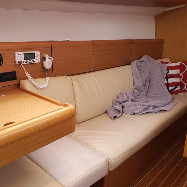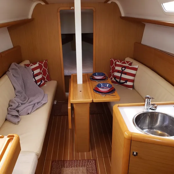 The sporty 19/20ths rig has two sets of swept spreaders and performance is gratifyingly nimble. With a sail area of 554 sq ft, she moves along swiftly in even the stiffest of breezes. Book online to charter the Jeanneau 33i, Breeze.