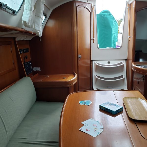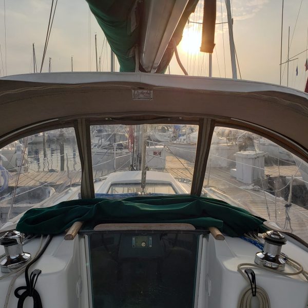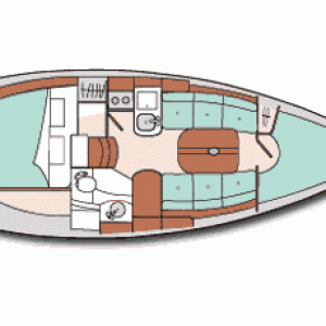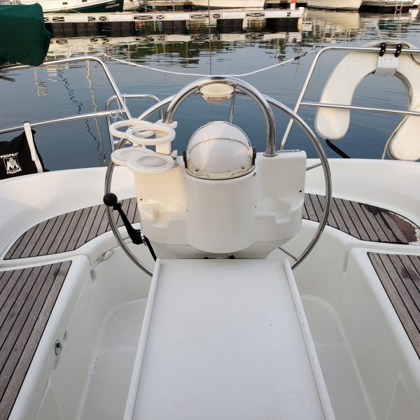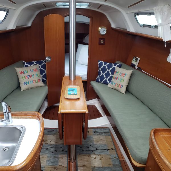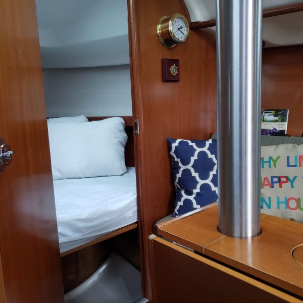 There is six-foot headroom throughout the cabin and 6′-3″ salon berths. The spacious cockpit includes stern pulpit seats and cockpit speakers. All of these features make her a versatile boat perfect for family cruising, or for simply relaxing and watching the sunset at anchor.