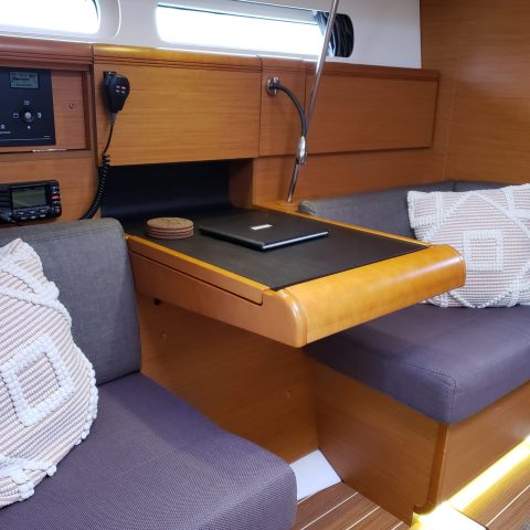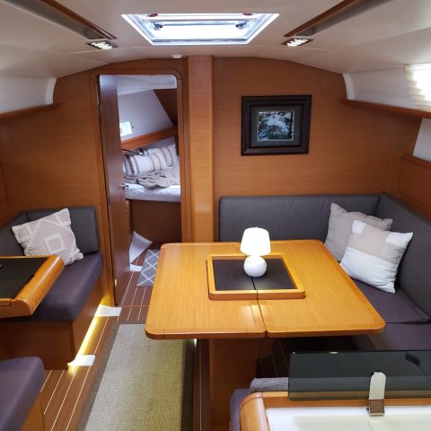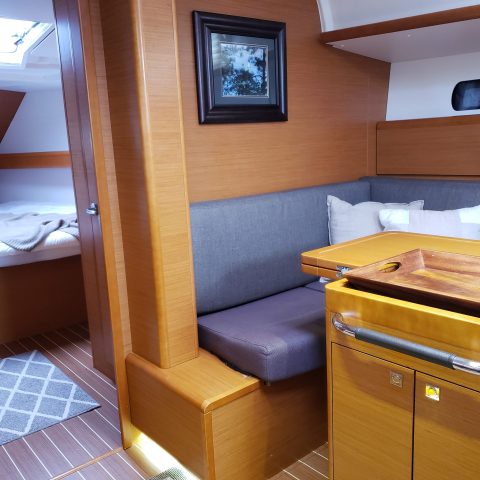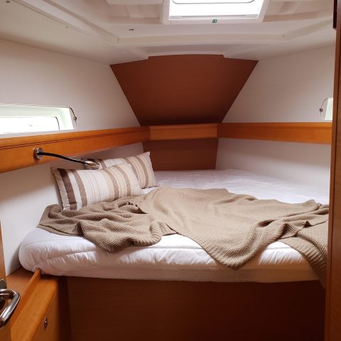 The Sun Odyssey 409 has an innovative deck plan and sleek styling. The mainsheet leads back to each helm; integrated lines make for a clean and safe deck layout. Hatches are flush on the deck and there is easy access to the water via the fold-down transom.